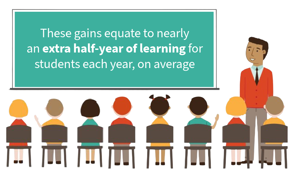 - By the third year of implementation, this increased growth was adding an extra 0.8 months (about 3.5 weeks) of learning for these teachers’ students annually.